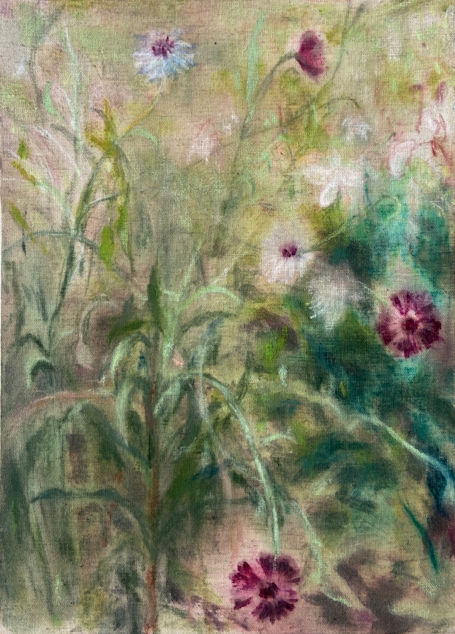 4年程前に描いていて、最近加筆して完成した絵。 サイズ:220×273×20(mm) 素材:パネルに綿布、油彩、オイルパステル 制作年:2020-2024